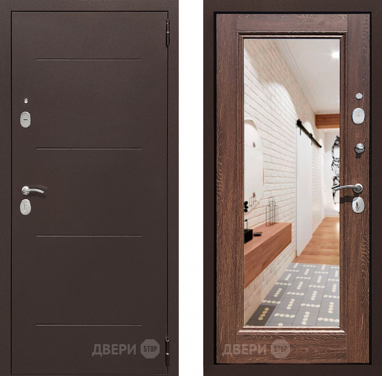 Входная металлическая Дверь Престиж 100 с зеркалом Медь/Дуб филадельфия коньяк 860х2050 мм